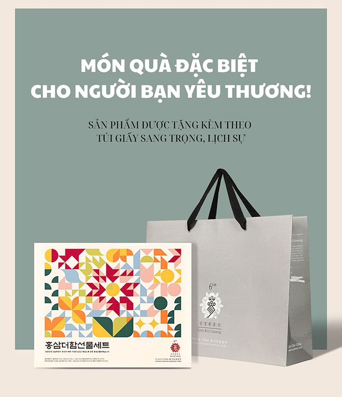 – Cùng với 6 thành phần nguyên liệu phụ trợ: Mật ong rừng, táo đỏ, kỉ tử, gừng, nấm linh chi, quế. – Kim’s Red Ginseng luôn chú trọng vào phương pháp Chiết xuất nước tinh khiết thay vì phương pháp Chiết xuất cồn. ( Chiết xuất nước tinh khiết: Thời gian chiết xuất lâu nhưng hương vị đậm đà Chiết xuất cồn: Thời gian chiết nhanh hơn nước tinh khiết, loại bỏ độ ẩm và rút ngắn thời gian sản xuất.)