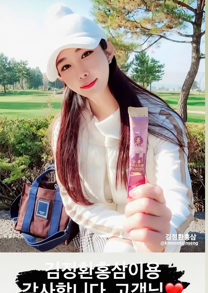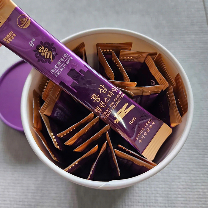 Nước tinh khiết, nước hồng sâm (6 tuổi, hàm lượng chất rắn từ 60% trở lên, tổng hàm lượng ginsenosides Rg1, Rb1 và Rg3 10mg/g, sản xuất trong nước) 10% (Tỷ lệ trộn nhân sâm thô: 70% nhân sâm đỏ, 30% nhân sâm tái), tử đương, hỗn hợp có đặc trưng vị thảo dược (có đặc tính hợp tác thảo dược vị tại: ngải cứu Injin (sản xuất tại Trung Quốc), ngải cứu sinh (sản xuất tại Trung Quốc), táo tàu (sản xuất tại Hàn Quốc), rễ cây bạch chỉ (sản xuất tại Hàn Quốc), Gujeolcho (sản xuất tại Hàn Quốc), Rehmannia glutinosa, Mugwort, Cheongung, Shojgu, Peony Astragalus, Bokryeong, nấm linh chi, Cam thảo, nước tinh khiết, từ đường).